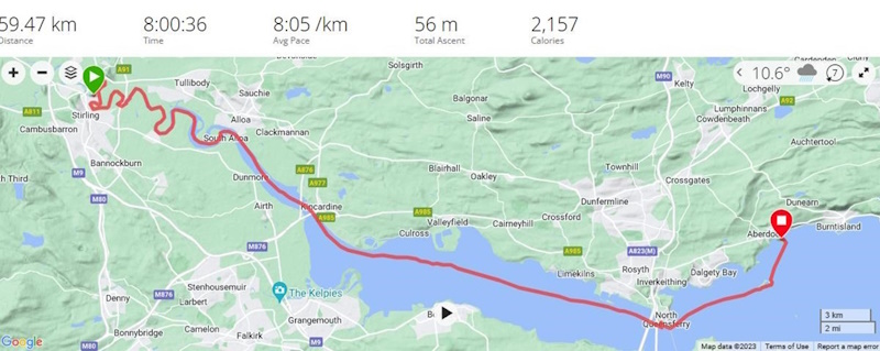 We managed the 60km trip in 8 hours, and that included a half-hour late lunch stop at LSKC North Queensferry. So our time on the move was 7h33m.