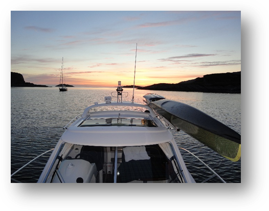 They had spotted my River Racer on 'Tiptoe', and one of them, with his own yacht, had read about ‘Tiptoe’ + kayak in 'Yachting Life'. (photo shows racing kayak on roof of ‘Tiptoe’, moored in bay at north end of Jura with the west entrance to the Corryvreckan in the background, at 10pm, taken the previous year in June) I enjoyed a short exchange of news with my old friends, but they were keen to keep going because there was only another half hour of tide at Cuan Sound, and they were certainly not going to zip up it at 4 knots. So, no cups of tea for them on board the ‘mother ship’ I’m afraid. 😊